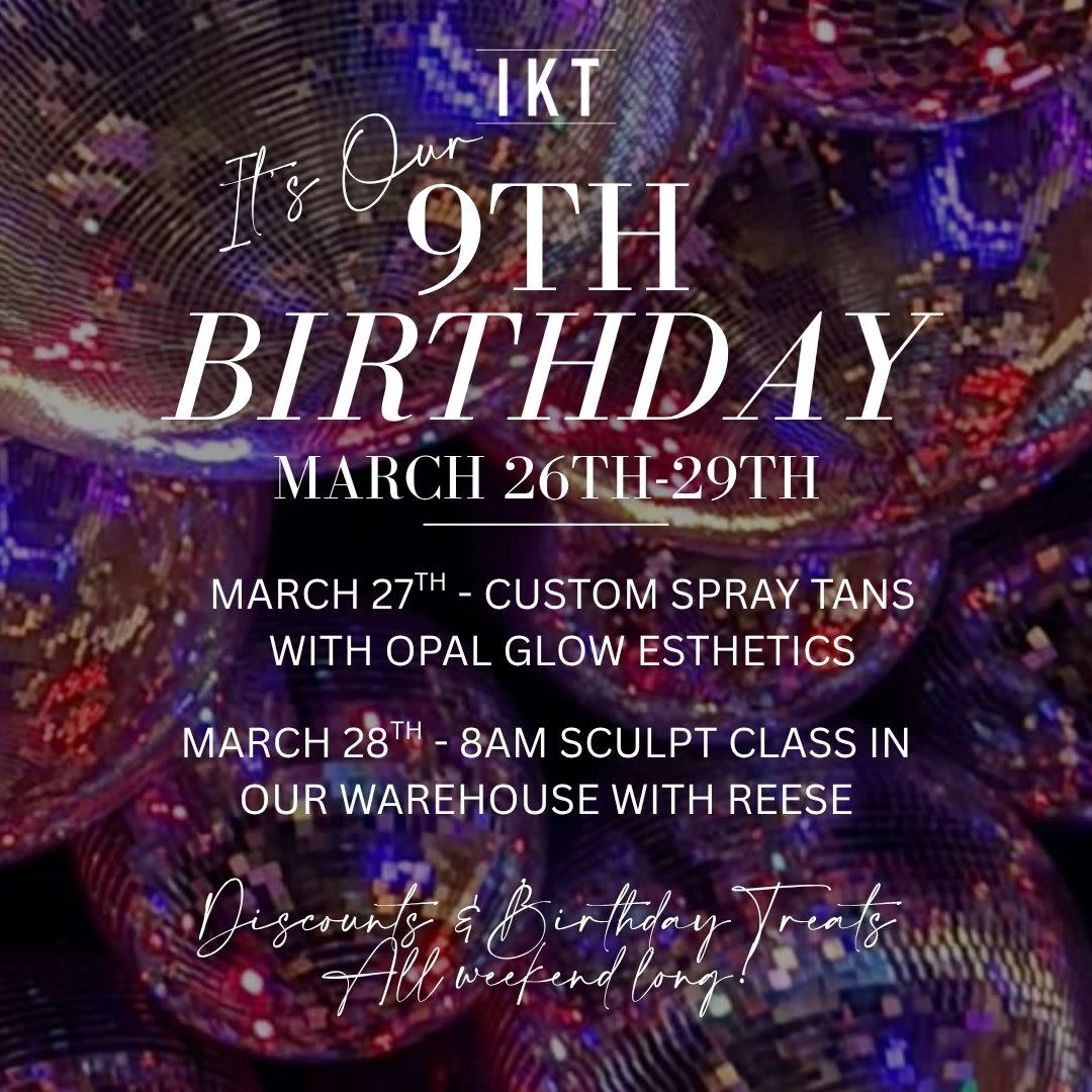 It's birthday week!! 🖤🪩 Come celebrate 9 years with us! 🎉 We will be running discounts and having birthday treats ALL weekend long! March 27th - Custom spray tans with IKT x Opal Glow Esthetics in our warehouse form 10-2pm ☀ Walk ins welcome! March 28th - 8am sculpt class in our warehouse with Reese!