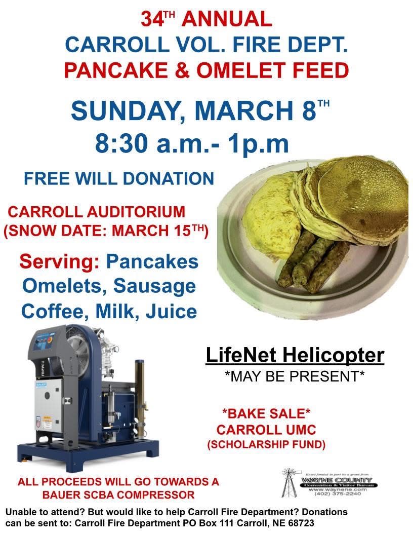 34th Annual Carroll Volunteer Fire Department Pancake & Omelet Feed. Serving Pancakes, Omelets, Sausage, Coffee, Milk & Juice.