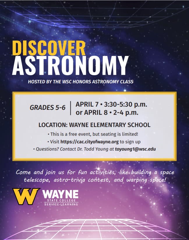 April 7 @ 3:30pm-5:30pm or April 8 @ 2:00pm-4:00pm Grades 5-6 The WSC Honors Astronomy Class will be hosting Discover Astronomy Camps again this spring! This hands-on, interactive camp is a great opportunity for kids to explore space, stars, planets, and more in a fun and engaging environment. Important: Please review the flyers below and select ONE date your child will attend. Camp Locations: • 1st & 2nd Grade: Early Learning Center • 3rd–6th Grade: Wayne Elementary School Register Online Today: Visit cac.cityofwayne.org to get registered!