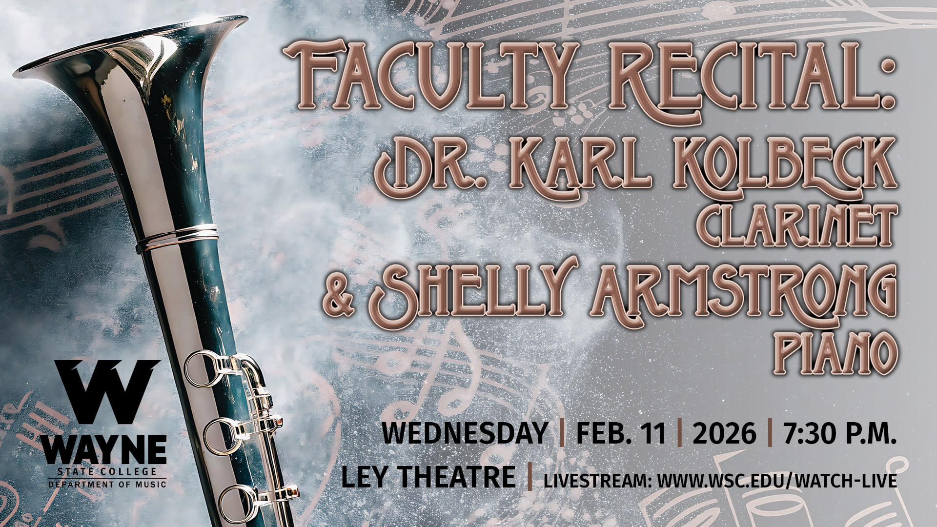 Dr. Karl Kolbeck, clarinet Shelly Armstrong, piano 7:30pm on Wednesday, February 11th in Ley Theatre Livestream: www.wsc.edu/watch-live
