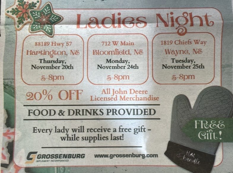 Tuesday, November 25th | 5:00-8:00pm 1819 Chiefs Way, Wayne NE 20% off All John Deere License Merch Food & Drinks provided, and every lady will receive a free gift while supplies last!Images