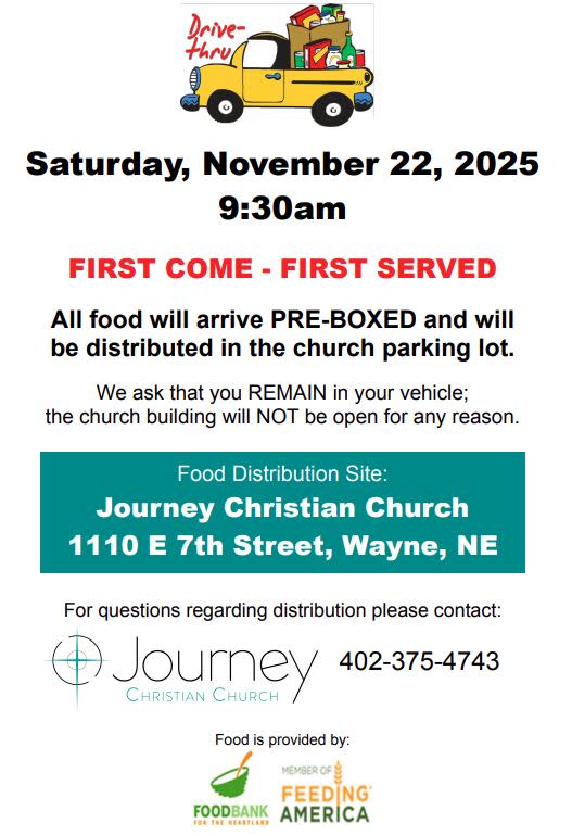 First Come, First Served! Saturday, November 22 at 9:30am All food will arrive pre-boxed and distributed in the church parking lot. Distribution site: Journey Christian Church Journey Christian Church 1110 E 7th Street 402-375-4743Images