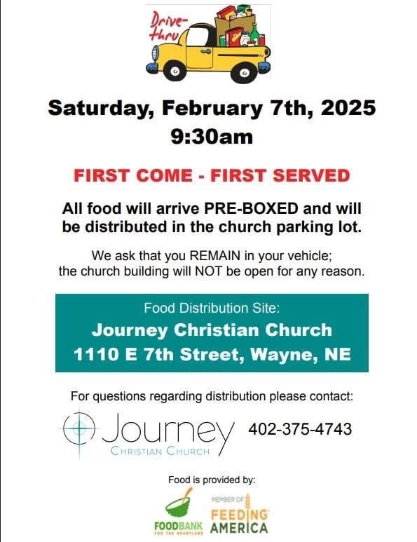 First Come, First Served! Saturday, February 7 @ 9:30am All food will arrive pre-boxed and distributed in the Journey church parking lot. Distribution site: Journey Christian Church Journey Christian Church 1110 E 7th Street 402-375-4743