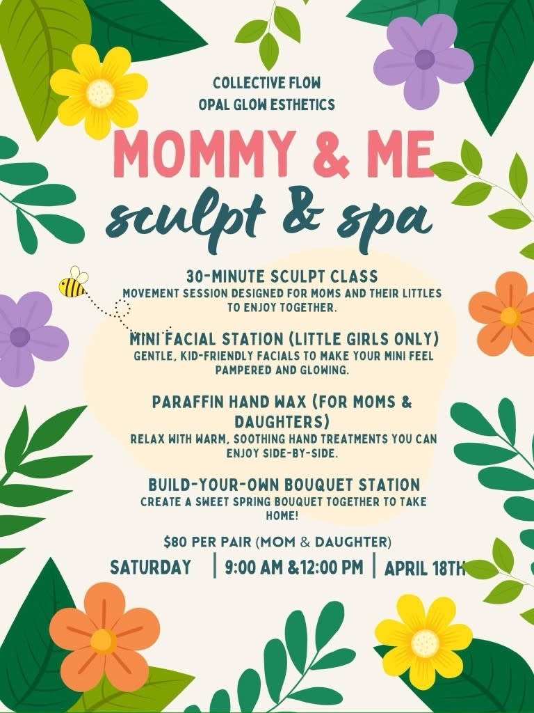 Saturday April 18 @ 9:00am & 12:00pm / $80 per pair (mom & daughter) / 30-min sculpt class, mini facial station, paraffin hand wax, Build Your Own Bouquet stationImages