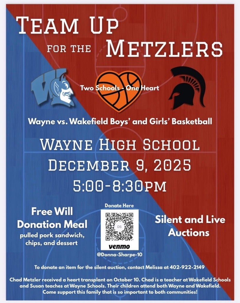 Wayne High School December 9 @ 5:00pm-8:30pm Free-will donation meal (pulled pork, chips, dessert) Silent and Live auctions *to donate an item for the silent auction, contact Melissa at 402-922-2149Images