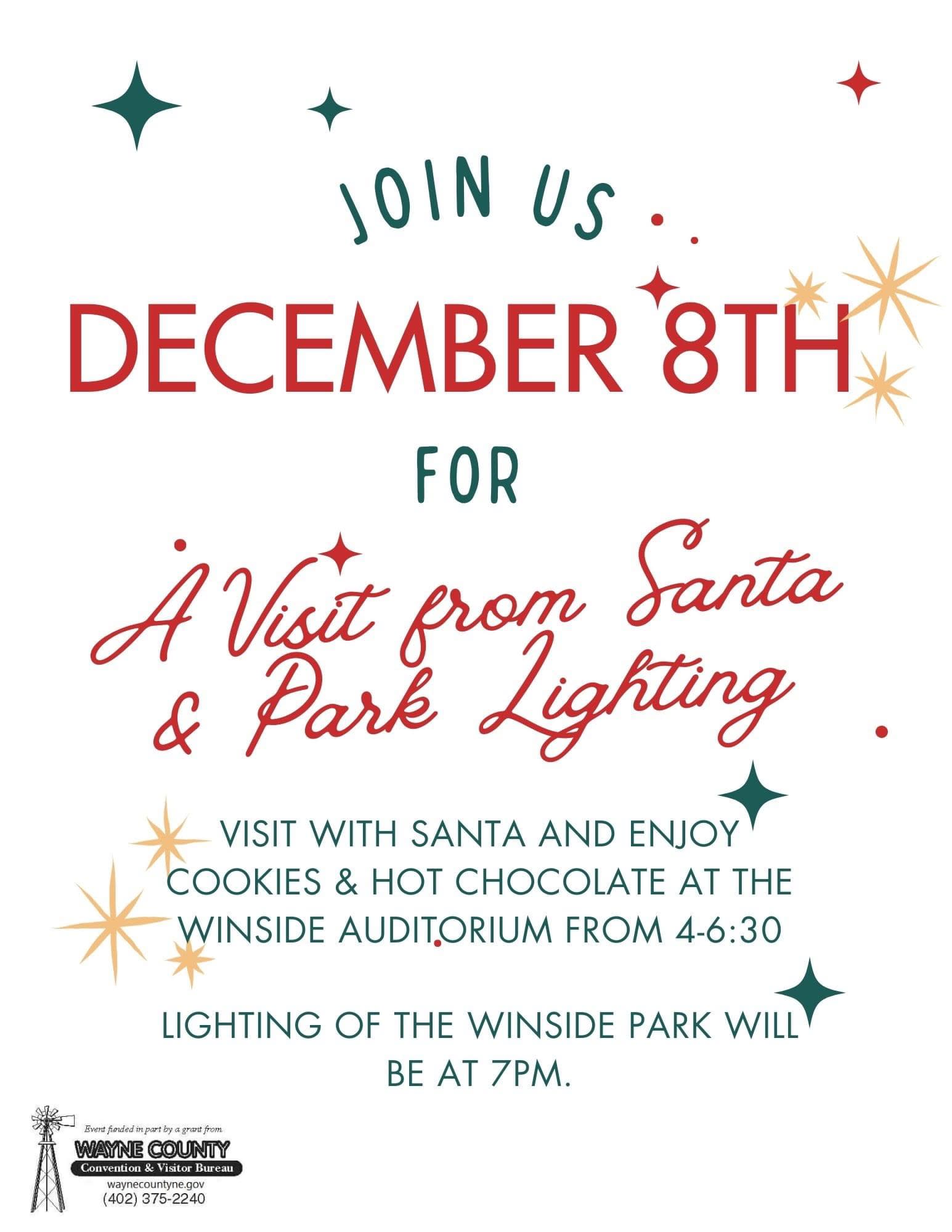 Visit with Santa and enjoy Cookies and Hot Chocolate at the Winside Auditorium! Lighting of the Winside Park will be at 7:oopmImages