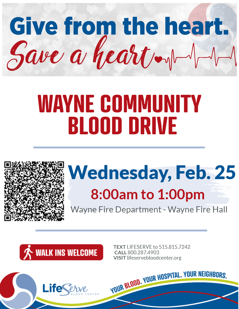 There will be a community blood drive at the Wayne Fire Hall on Wednesday, February 25 from 8:00am - 1:00pm. Schedule a blood donation appointment online at lifeservebloodcenter.org or call 800-287-4903. LifeServe Blood Center is a non-profit, community-based blood center that has served the needs of local hospitals and patients in their regions since 1947. As one of the 15 largest blood centers in the country, LifeServe provides blood products to 175 hospitals primarily in Iowa, Nebraska, South Dakota and Illinois. LifeServe is committed to saving lives by providing premier service to volunteer blood donors and access to a safe, quality blood supply for hospitals and patients. Your donation with LifeServe will help save your neighbor, a friend or family member or a stranger on the street.Images