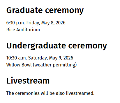 Graduate ceremony 6:30 p.m. Friday, May 8, 2026 Rice Auditorium Undergraduate ceremony 10:30 a.m. Saturday, May 9, 2026 Willow Bowl (weather permitting) Livestream: https://www.wsc.edu/watch-liveImages