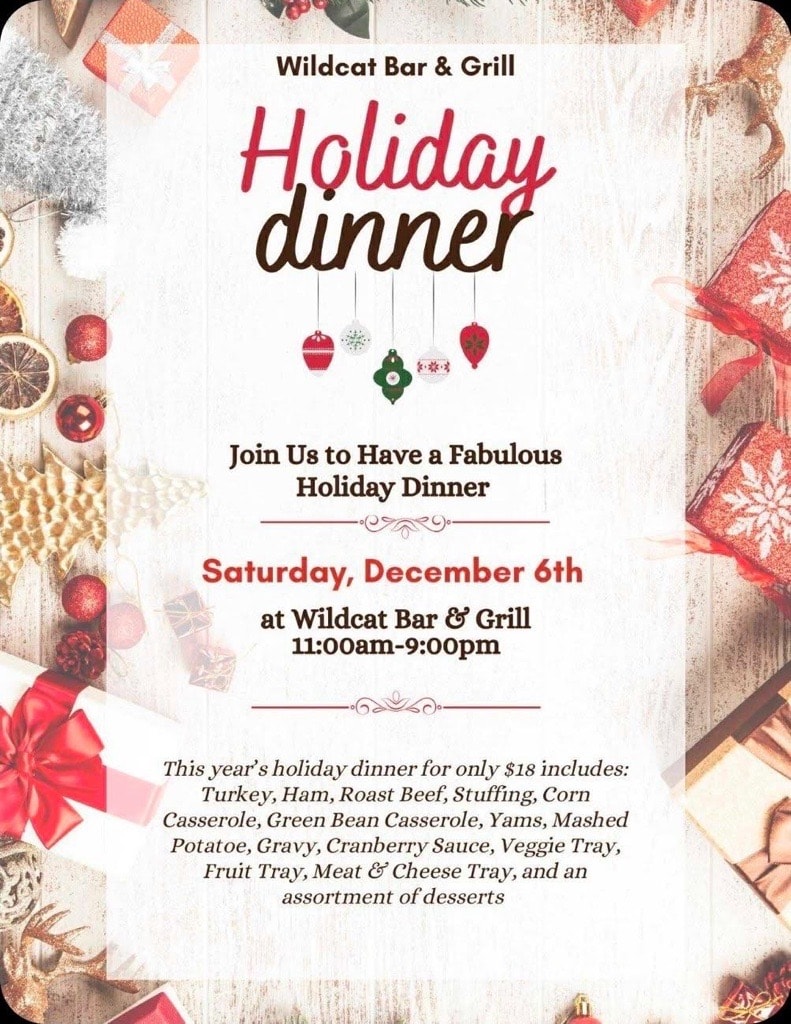 Saturday, December 6th from 11:00am-9:00pm For only $18, the dinner includes: Turkey, ham, roast beef, stuffing, corn casserole, green bean casserole, yams, mashed potatoes, gravy, cranberry sauce, veggie tray, fruit tray, meat & cheese tray, and an assortment of dessertsImages
